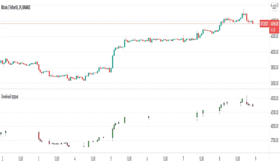 I decided to help TradingView programmers and wrote code that converts a standard candles / bars to a line break chart. The built-in linebreak() and security() functions for constructing a Linear Break chart are bad, the chart is not built correctly, and does not correspond to the Line Breakout chart built into TradingView. I’m talking about simulating the Linear Break lines using the plotcandle() annotation, because these are the same candles without shadows. When you try to use the market simulator, when the gaps are turned on in the security() function, nothing is added to the chart, and when turned off, a completely different line break chart is drawn. Do not try to write strategies based on the built-in linebreak() function! The developers write in the manual: "Please note that you cannot plot Line Break boxes from Pine script exactly as they look. You can only get a series of numbers similar to OHLC values for Line Break charts and use them in your algorithms." However, it is possible to build a “Linear Breakthrough” chart exactly like the “Linear Breakthrough" chart built into TradingView. Personally, I had enough Pine Script functionality.
