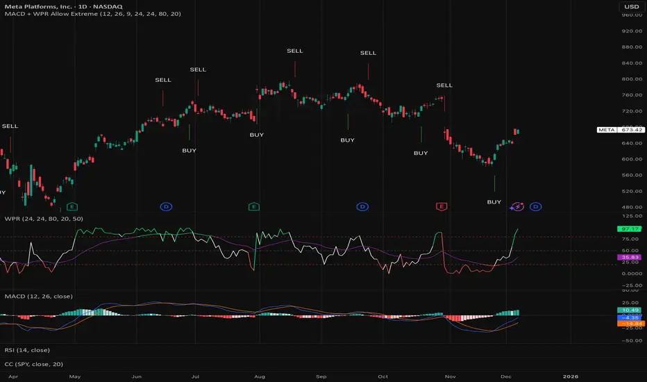 Unlike most oscillators, this version deliberately removes the traditional “do not buy when overbought / do not sell when oversold” filters. This allows the script to catch powerful trend reversals and explosive moves immediately — even on violent earnings gaps or panic sell-offs (example: META’s -11 % drop on Oct 30 2025 triggered an instant sell even though %R was deeply oversold).