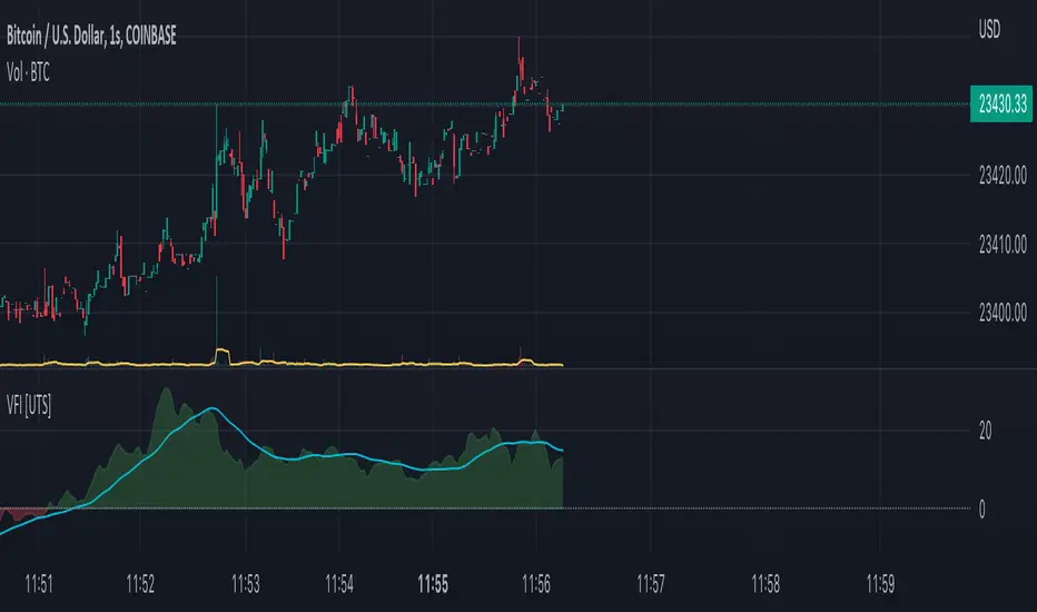 A simplified interpretation of the VFI is that values above zero indicate a bullish state and the crossing of the zero line is the trigger or buy signal.