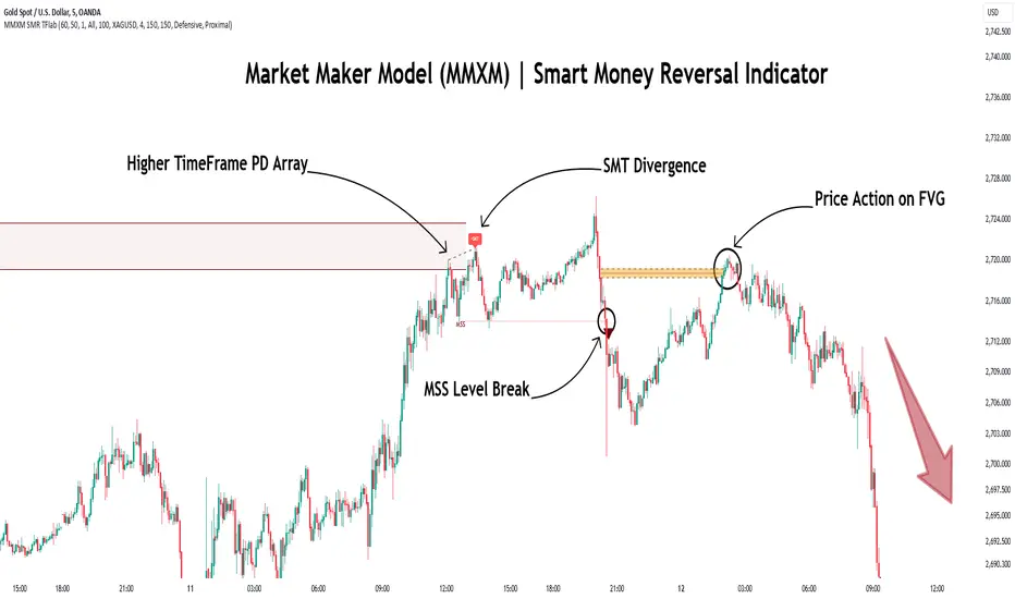 The MMXM Smart Money Reversal leverages key metrics such as SMT Divergence, Liquidity Sweep, HTF PD Array, Market Structure Shift (MSS) or (ChoCh), CISD, and Fair Value Gap (FVG) to identify critical turning points in the market. Designed for traders aiming to analyze the behavior of major market participants, this setup pinpoints strategic areas for making informed trading decisions.