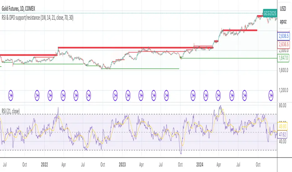 This indicator combines the Relative Strength Index (RSI) to identify overbought and oversold conditions with the Detrended Price Oscillator (DPO) to highlight support and resistance levels.
