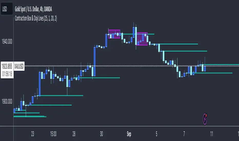 Contraction & Doji Lines indicator is designed to identify and visualize potential support and resistance levels on a price chart. It does this by detecting doji candlestick patterns and drawing horizontal lines from the middle of the doji bodies to the right. Additionally, it also highlights price contraction zones with colored boxes.