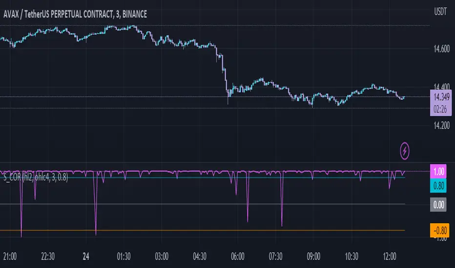 In this small indicator I make it possible for the user to set two different input sources. Then, the indicator displays the correlation of these two input sources. It's a very small script, but I think it could be helpful to somebody to find uncorrelated indicators for his trading strategy. To use uncorrelated indicators is in general recommended.