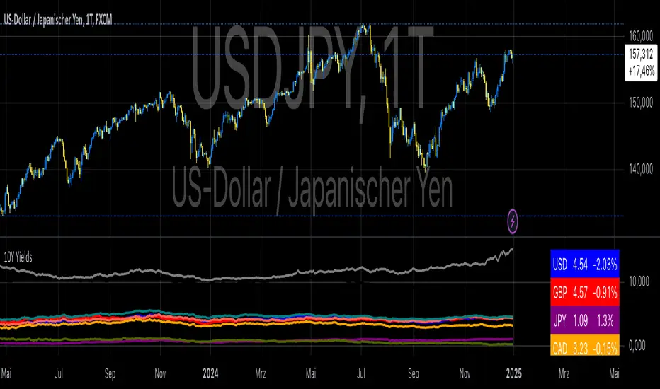 Plotting Yield Trends: In addition to the table, the indicator plots the 10-year yields as lines on the chart, allowing for immediate visual reference of yield movements across different currencies. The plotted lines provide a dynamic view of the yield curve, which is a vital tool for economic analysis and forecasting (Campbell et al., 2017).