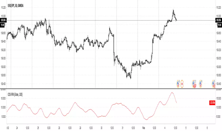 Essentially, you get a real-time (low lag) plot of the cycle period in bars. If the COS IFM reads "16" then you can expect the distance between swing highs and swing lows to be approx. 16 bars.