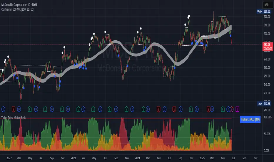 The Ticker Pulse Meter Basic is a dynamic Pine Script v6 indicator designed to provide traders with a visual representation of a stock’s price position relative to its short-term and long-term ranges, enabling clear entry and exit signals for long-only trading strategies. By calculating three normalized metrics—Percent Above Long & Above Short, Percent Above Long & Below Short, and Percent Below Long & Below Short—this indicator offers a unique "pulse" of market sentiment, plotted as stacked area charts in a separate pane. With customizable lookback periods, thresholds, and signal plotting options, it empowers traders to identify optimal entry points and profit-taking levels. The indicator leverages Pine Script’s force_overlay feature to plot signals on either the main price chart or the indicator pane, making it versatile for various trading styles.