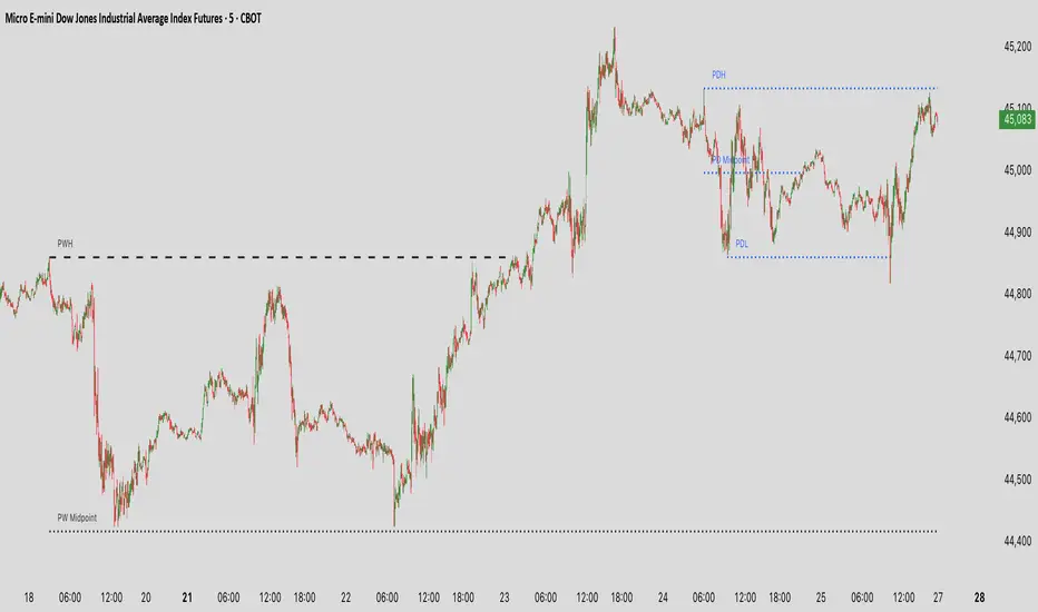 The script plots the previous day and week high and low as well as the midpoint of the range between the daily and weekly high and low. These lines stop printing once a price candle crosses the lines.