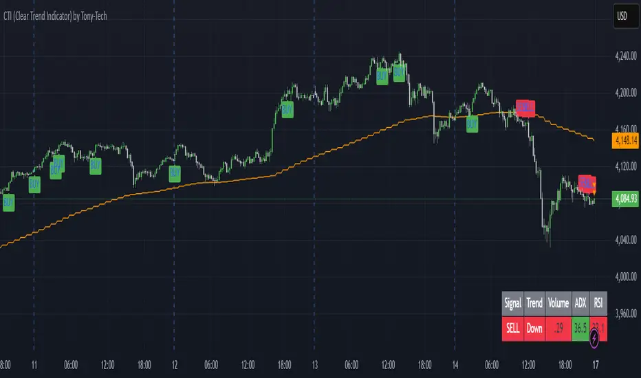 The Clear Trend Indicator (CTI) is a multi-timeframe trend and momentum confirmation tool designed to filter market noise and deliver high-quality Buy/Sell signals. It blends HTF EMA direction, RSI structure, ADX strength, CCI breakout detection, and optional volume confirmation into one compact system.