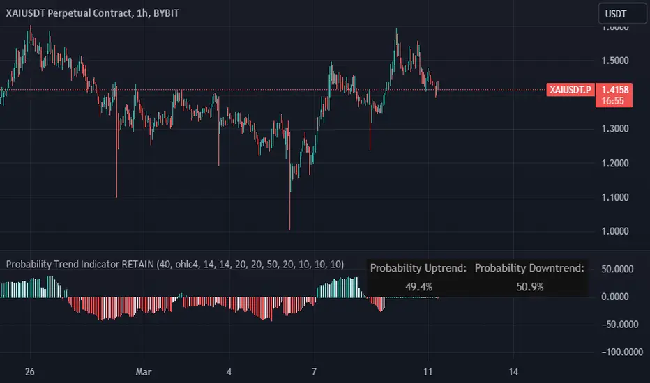 The indicator calculates the probabilities of upward and downward trends based on the percentage change in price over a specified lookback period.