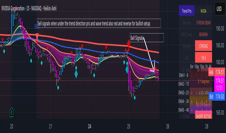 The Trinity Trend Pro is a no-nonsense trend filter indicator built around the classic 13 / 48 / 200 EMA stack, but massively upgraded with real intelligence. Instead of just drawing three lines and spamming crossovers like every other EMA script, it only speaks when a genuine, high-reward trend is actually happening. It combines three strict conditions that must all be true at the same time: perfect bullish or bearish EMA alignment, steep slope on all three EMAs (measured in degrees), and wide enough separation between the fast and slow EMA (normalized by ATR). If any of those fail, it stays silent. This eliminates almost all the fakeouts and chop that destroy most traders using regular EMA crossovers.