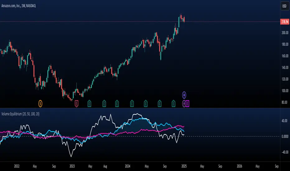 This indicator is composed of three different lengths of the same indicator. Short, Mid, and Long term representations of Volume Equilibrium. The difference between the mid and long term are highlighted so to make it easy to see where volume is going relative to a longer time frame.