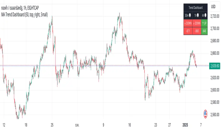 The MA Trend Dashboard is a versatile and user-friendly indicator designed to provide a comprehensive overview of market trends across multiple timeframes using moving averages (MAs). Here's what this script offers: