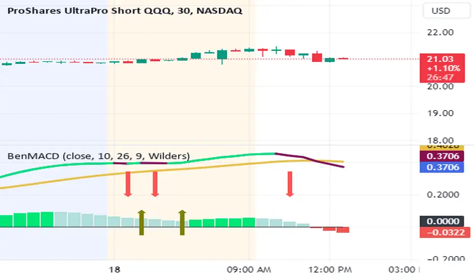 I can help setup alerts for you if need be, or if you're fluent in TradingView, you're welcome to do that yourself. The premise here, is that the upsignal is a bullish indicator (and is indicated with a green up arrow on the BenMACD chart) and the downsignal is a bearish indicator (and is indicated with a red down arrow on the BenMACD chart).