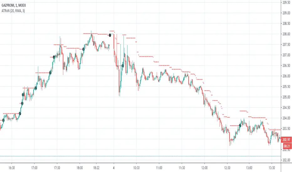 Индикатор показывает диапазон цен рассчитанный как цена предыдущего закрытия +/- ATR * множитель