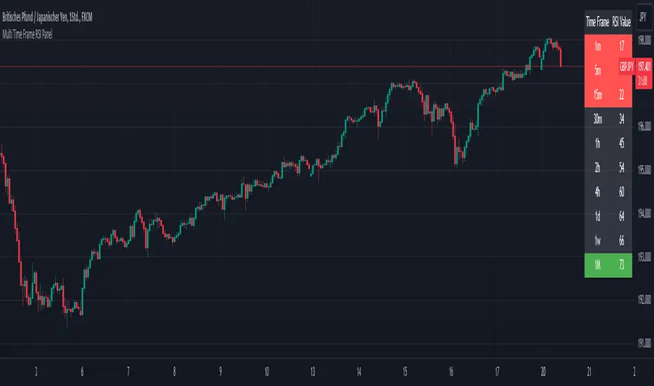 The "Multi Time Frame RSI Panel" indicator is a powerful tool designed to help traders analyze the Relative Strength Index (RSI) across multiple timeframes simultaneously. While the core logic of this indicator is proprietary, this description aims to provide traders with an understanding of its functionality and utility.