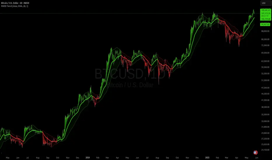 RMSD Trend is a trend-following indicator that utilizes Root Mean Square Deviation (RMSD) to dynamically construct a volatility-weighted trend channel around a selected moving average. This indicator is designed to enhance signal clarity, minimize noise, and offer quantitative insights into market momentum, ideal for both discretionary and systematic traders.
