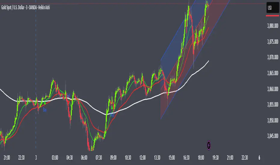 Buy and Sell indicator with Three EMA (21,50,200) + Channel trend