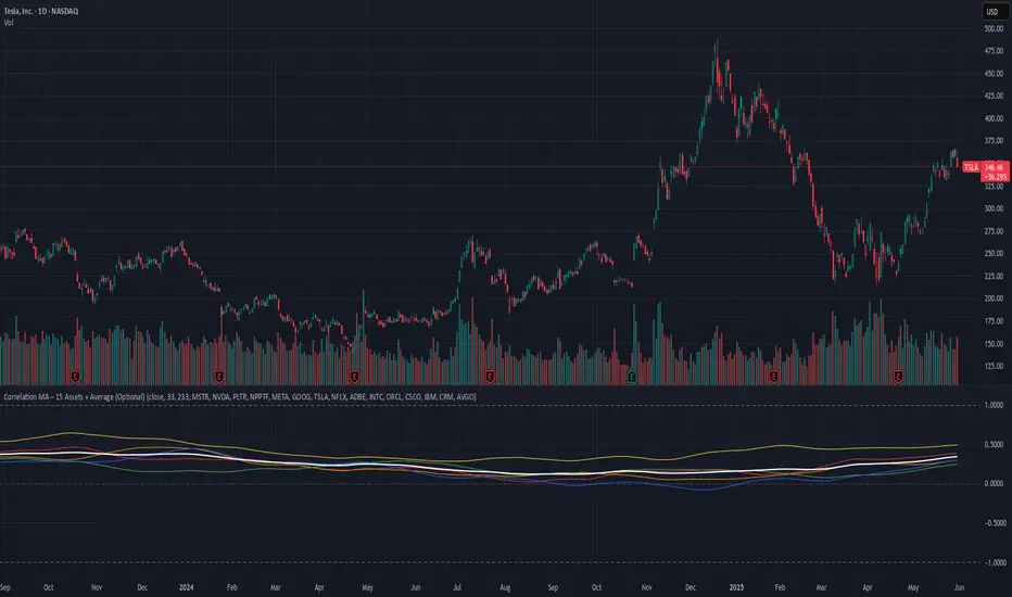 This indicator calculates the moving average of the correlation coefficient between your charted asset and up to 15 user-selected symbols. It helps identify uncorrelated or inversely correlated assets for diversification, pair trading, or hedging.
