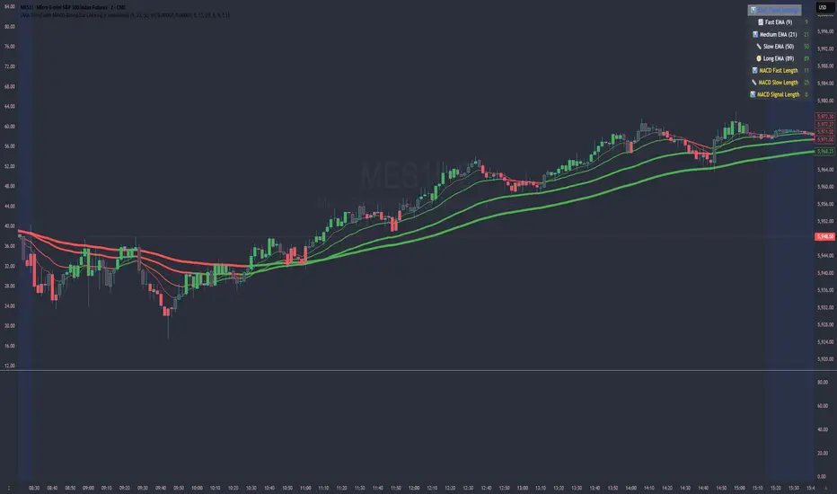 This indicator blends trend-following EMAs with MACD-based momentum signals to provide a visually intuitive view of market conditions. It's designed for traders who value clean, color-coded charts and want to quickly assess both trend direction and overbought/oversold momentum.