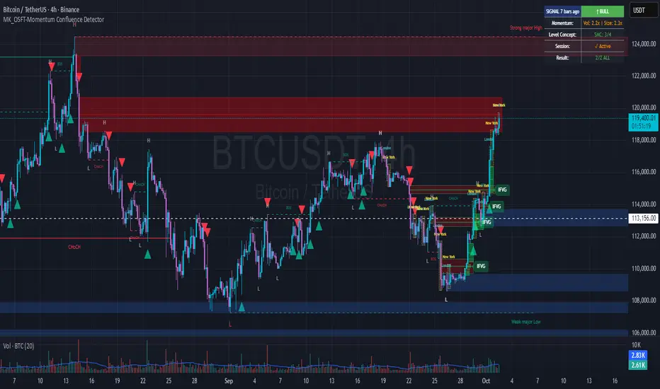 The Momentum Confluence Detector is a comprehensive Pine Script indicator designed to identify high-probability trading opportunities by detecting momentum bars that align with multiple confluence factors. It combines traditional technical analysis with advanced Smart Money Concepts to filter out noise and highlight the most significant price movements.