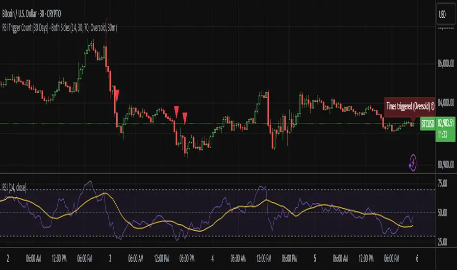This indicator tracks both oversold (crossunder) and overbought (crossover) RSI events on a 30-minute chart, featuring: