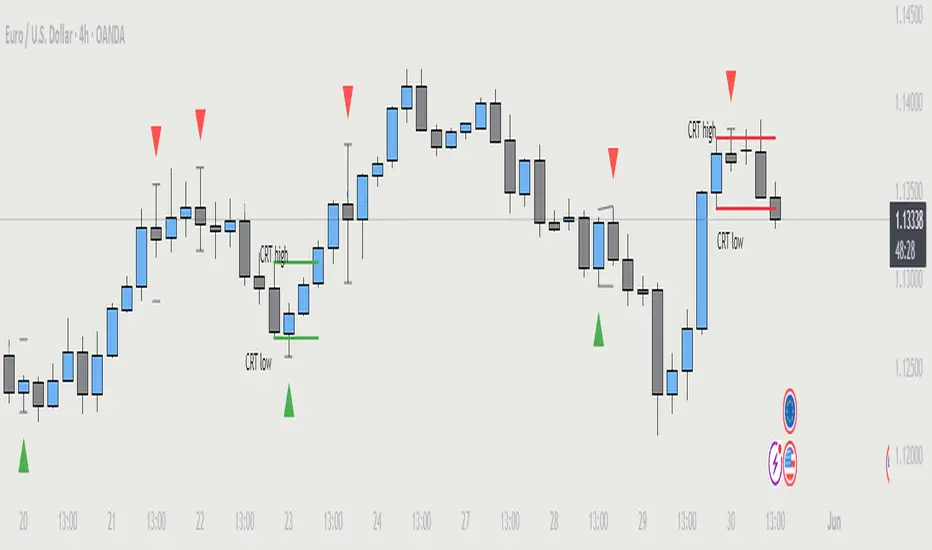 It analyzes pairs of candles to detect Bullish or Bearish CRT patterns and provides visual signals (triangles) and alert notifications to support scalp or swing trading strategies.
