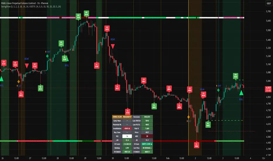 Swing Flow is designed for traders who want to align with market structure rather than fight it, entering positions near logical support levels with predefined invalidation points that keep losses small when wrong while allowing profits to run when the structure thesis proves correct. The combination of structure detection, early warning alerts, comprehensive market data, and visual scoring bars provides everything needed to identify high-probability setups and manage risk effectively.