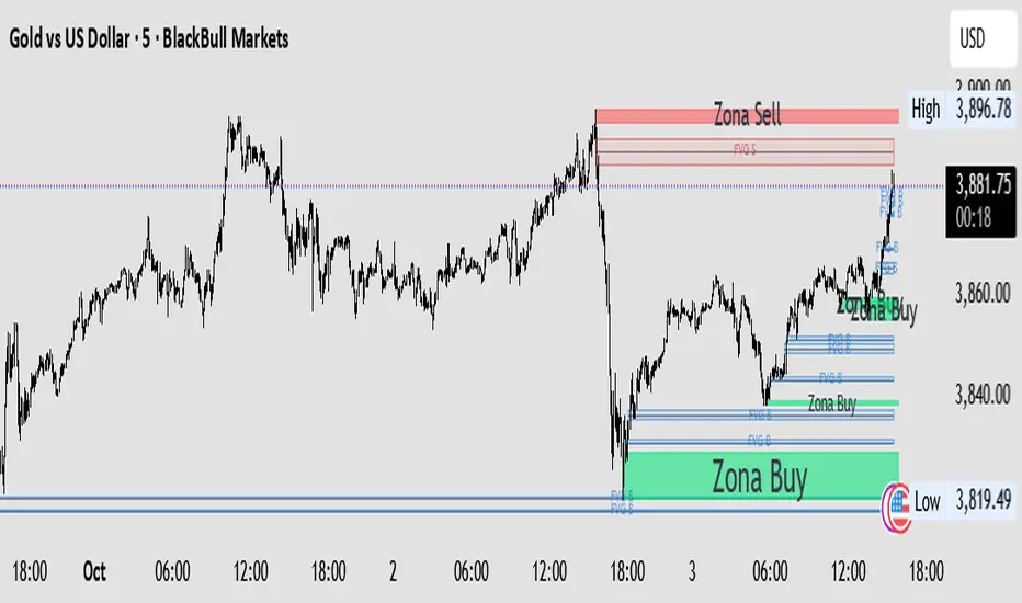 Detectează automat Order Blocks (Supply/Demand) din pivoti L/R, promovează candidații la zone active la mitigare, marchează evenimentele FLIP (Supply→Demand și invers) și desenează Fair Value Gaps (FVG) cu opțiune de linie la 50%. Adaugă proiecție MTF a OB-urilor, etichetare auto în interiorul zonelor și alerte — obții harta completă de execuție pentru aur.