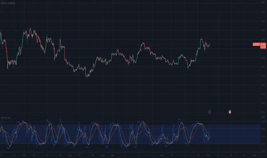 Moonhub Index combines several popular technical indicators to create an aggregated index that aims to give a clearer overall picture of the market. The index takes into account the current market condition (trending, ranging, or volatile) to adjust its calculations accordingly.