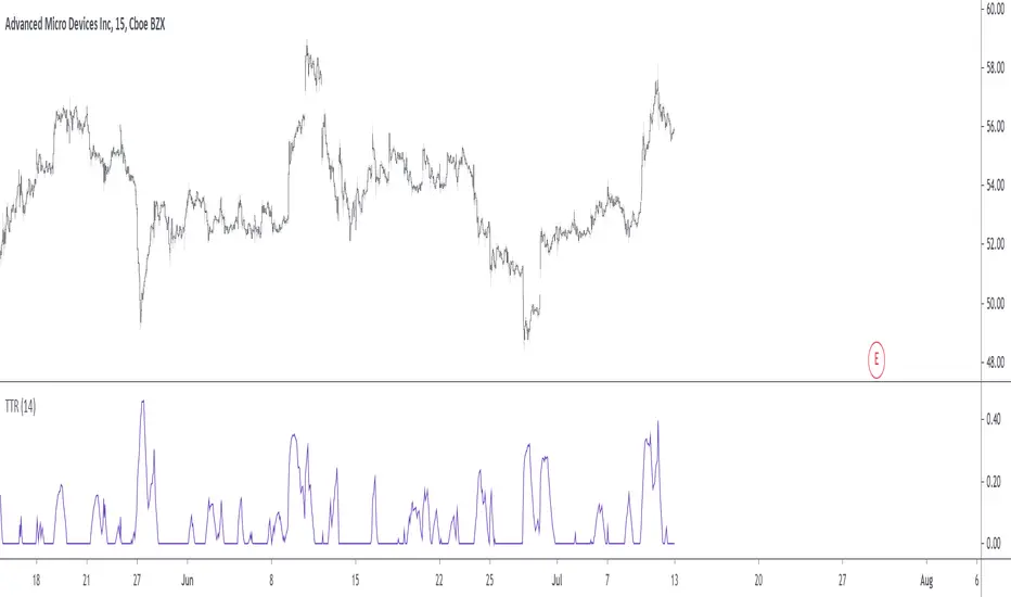Display a smoothed true range during trending markets, thus filtering any measurement occurring during ranging markets. Whether the market is trending or ranging is determined by the position of the efficiency ratio relative to its Wilder moving average.