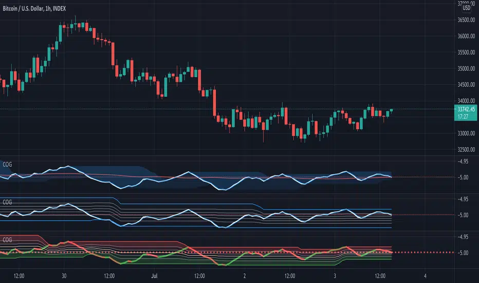 The COG Oscillator (center of gravity) is an indicator based on statistics and the Fibonacci golden ratio. It uses ALMA as a trigger and LSMA as "zero line". The trigger is set tight by default but can be tweaked by adjusting the window size and sigma in settings. This is a great indicator for setting up trades and spotting reversals. There are 2 main strategies that come with this indicator: