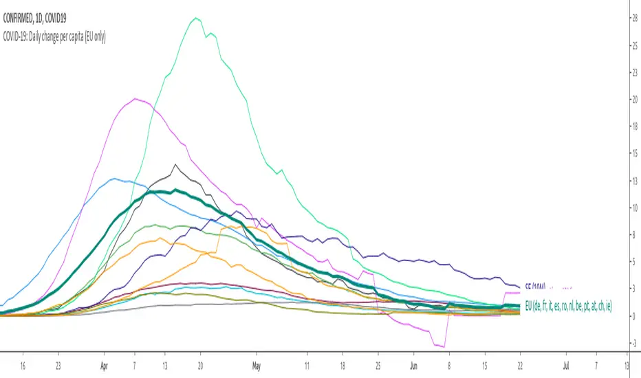 We can easily see that, at the moment (Apr 2nd, 2020), the most affected country is Spain (~150 new cases per million people per day) and surprisingly the second one is Switzerland (CH). We can also see Spain or Belgium's steep curve relative to other countries.