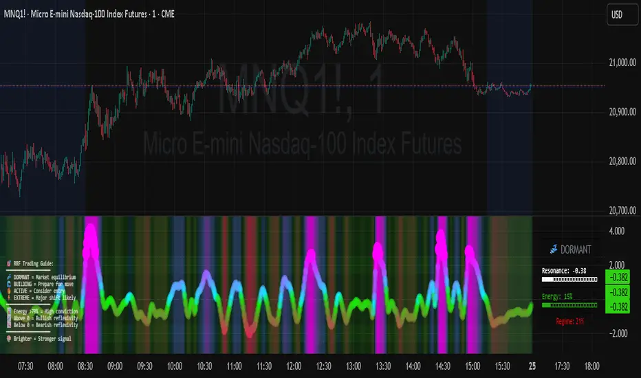 RRF – Quantum Flow is not a mashup of existing indicators. It is a novel oscillator that models the feedback loop between perception and participation, then quantifies and visualizes the resulting resonance. The multi-layered color logic, energy field, and regime strength dashboard are unique to this script. It is designed for anticipation, not confirmation—helping you see regime shifts before they are obvious in price.