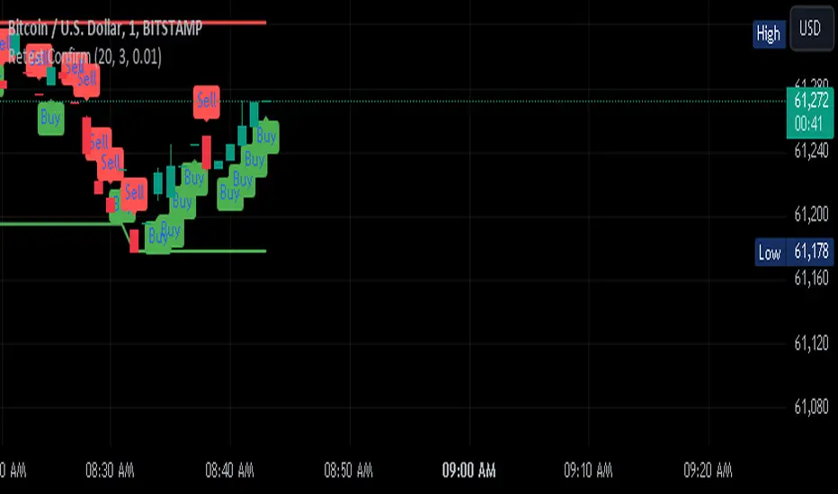 Creating a "Retest Confirm Point" indicator that generates buy and sell signals involves defining criteria to confirm that a price retest is valid before issuing a trade signal. This generally requires identifying a key level (such as support, resistance, or a trendline), detecting a retest of this level, and then confirming the validity of the retest.