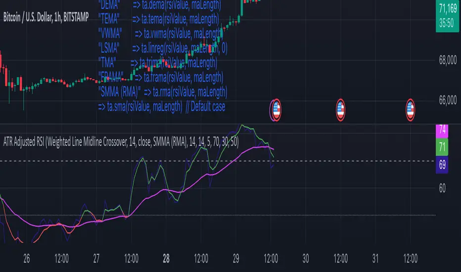 The ATR Adjusted RSI Indicator is a versatile indicator designed primarily for trend-following strategies, while also offering configurations for overbought/oversold (OB/OS) signals, making it suitable for mean-reversion setups. This tool combines the classic Relative Strength Index (RSI) with a unique Average True Range (ATR)-based smoothing mechanism, allowing traders to adjust their RSI signals according to market volatility for more reliable entries and exits.