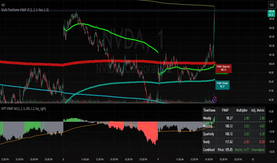 This indicator provides a unique perspective on potential price valuation by comparing the current price to the Volume Weighted Average Price (VWAP) anchored to the start of multiple timeframes: Weekly, Monthly, Quarterly, and Yearly. It synthesizes these comparisons into a single oscillator value, helping traders gauge if the current price is potentially extended relative to significant volume-weighted levels.