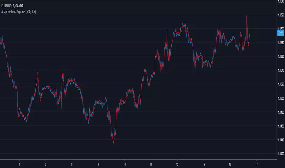 An adaptive filtering technique allowing permanent re-evaluation of the filter parameters according to price volatility. The construction of this filter is based on the formula of moving ordinary least squares or lsma, the period parameter is estimated by dividing the true range with its highest. The filter will react faster during high volatility periods and slower during low volatility ones.