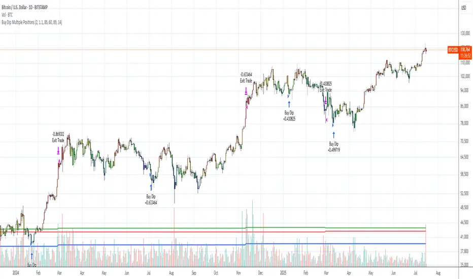 This strategy balances flexibility and precision, giving traders control over entry timing, capital allocation, and stop behavior. Ideal for those looking to automate dip-buy setups with tactical overlays and visual alerts.