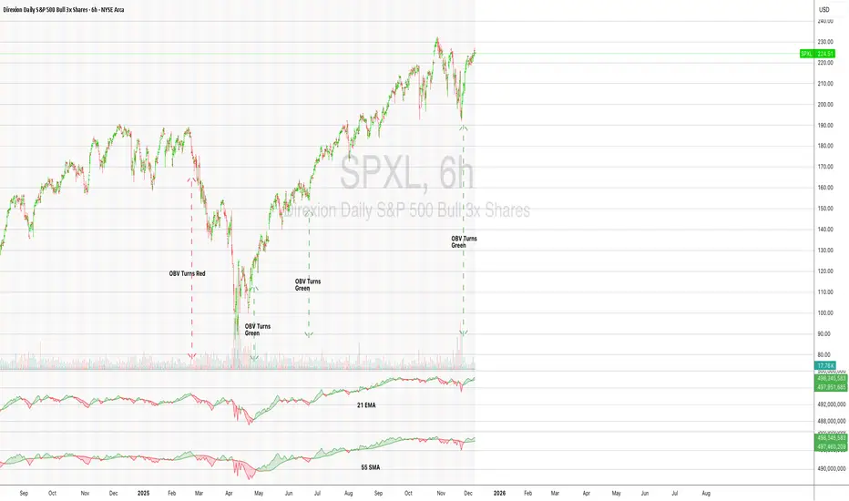 The indicator is added twice at the bottom; once with a 21 EMA and again with a 55 SMA. The chart has text and illustrations to show where the OBV flipped colors. More red equals more selling pressure. More green equals more buying volume or pressure.