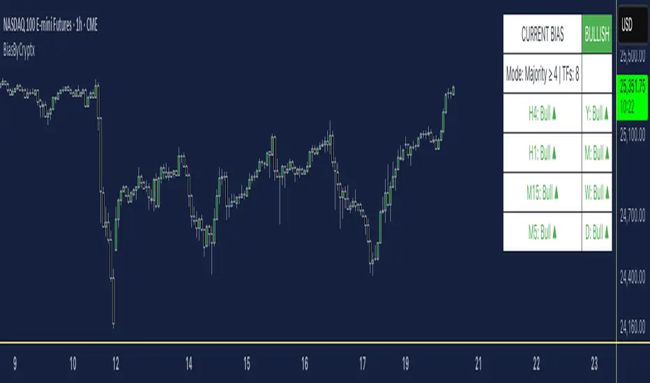 This is a lightweight market-bias dashboard. For each selected timeframe, Prior Year, Month, Week, Day, H4, H1. It uses the previous completed period’s high and low to compute the 50% midpoint, then labels Bullish when the current bar is above it, otherwise, Bearish.