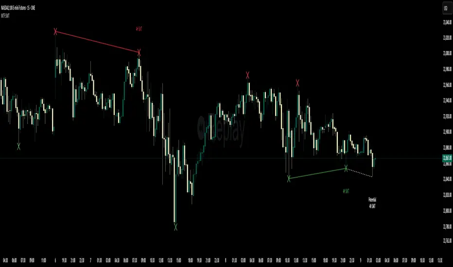 Watchline & Alert: When this "potential" divergence occurs, the script draws a dashed white line and triggers a "Potential SMT" alert. This isn't a confirmed SMT on the main timeframe yet, but it's a powerful early warning that one may be forming.
