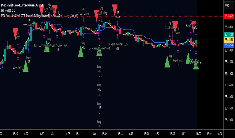 This MGC Futures strategy uses an adaptive ATR trailing stop combined with a volume-based exit filter. Trades trigger on EMA crossovers and exit only when opposite volume exceeds 65%, preventing early exits while locking profits dynamically as trends strengthen.
