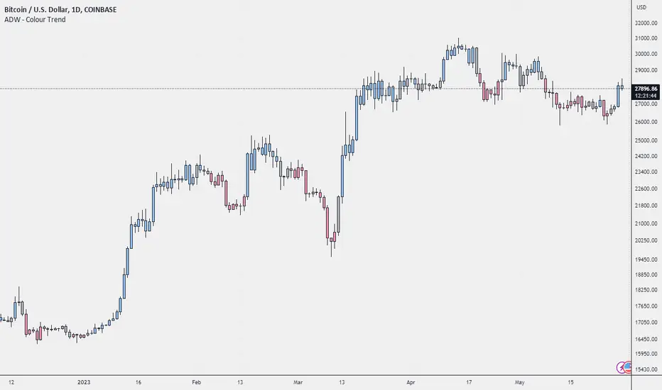 Colour Trend is an indicator that will give you a visual representation of the trend in a selected market, and alert you when the trend changes. The green colour represents a bullish trend (prices are going up), the red colour represents a bearish trend (prices are going down), and silver represents a neutral trend (prices are relatively stable). The script calculates these trends based on the relative price levels and their moving averages.