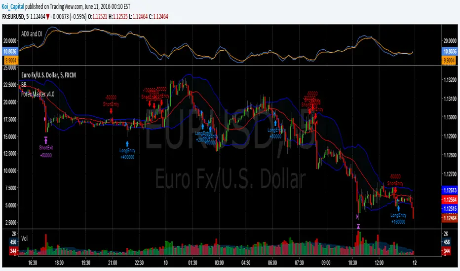 Forex Master v4.0 is a mean-reversion algorithm currently optimized for trading the EUR/USD pair on the 5M chart interval. All indicator inputs use the period's closing price and all trades are executed at the open of the period following the period where the trade signal was generated.