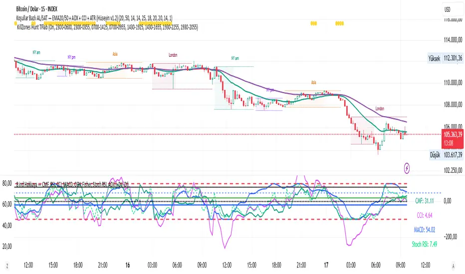 CMF, RSI, CCI, MACD, OBV, Fisher, Stoch RSI, ADX (+DI/-DI)