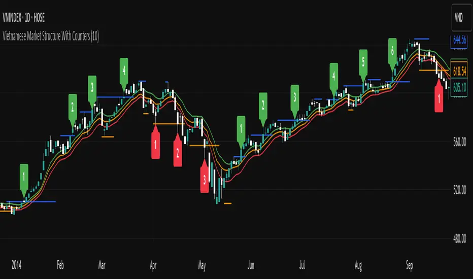 This indicator is designed to track Market Structure with Swing-Low Breakdowns and Swing-High Breakups specifically tailored for the Vietnamese stock market, though it can be applied elsewhere too. By default, it uses a 10-period EMA to dynamically detect key turning points in price action and count significant breakdowns or breakups from previous swing levels.