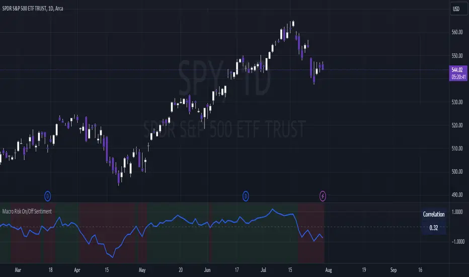 New version removes the old educational labels which cluttered the script and replaces them with a real-time correlation score of the macro risk index vs the current symbol. A correlation of 1 means the symbol is moving in the same direction and proportion to the risk index, and a correlation of -1 means the opposite.Interestingly, the correlation score validates the earlier instructions that the macro risk score is positively correlated to equities and negatively correlated to safe havens.