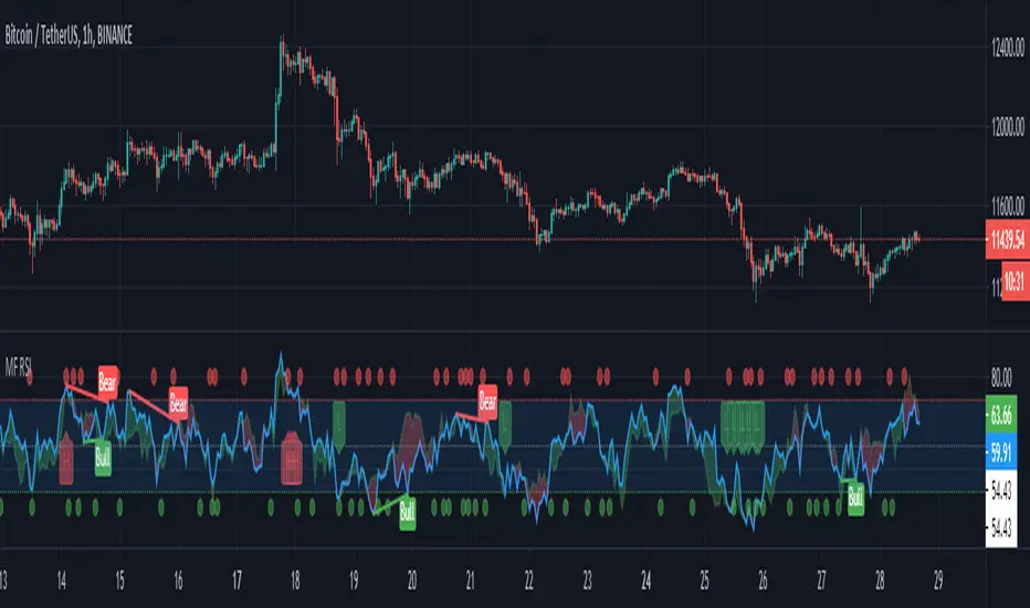 A alert condition is available on a potential reversal MFI crosses RSI on overbought or oversold.