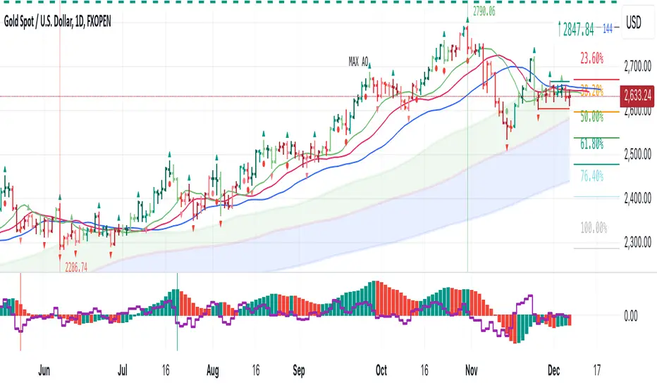 Added display on the chart of divergence on AO in correction after the highest and lowest bars in the interval of 140 bars from the last bar - ↑, if the trend is upward and ↓, if the trend is downward. Display can be enabled in the indicator settings in the "Display divergence on AO in correction > ✅" field.