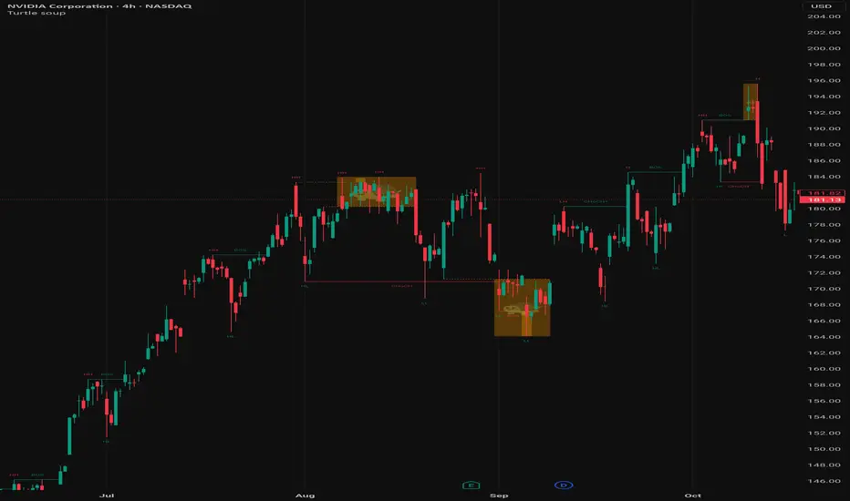 Alerts are available for when a turtle soup setup occurs and you can set the alert frequency of your liking (to get early signals with a script that might repaint or wait for a closed candle).